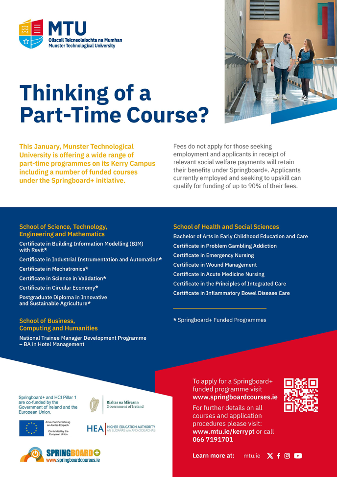 Цього січня MTU (Munster Technological University) пропонує широкий вибір програм з частковою зайнятістю в своєму кампусі в Керрі, включаючи низку курсів, що фінансуються в рамках ініціативи Springboard+.