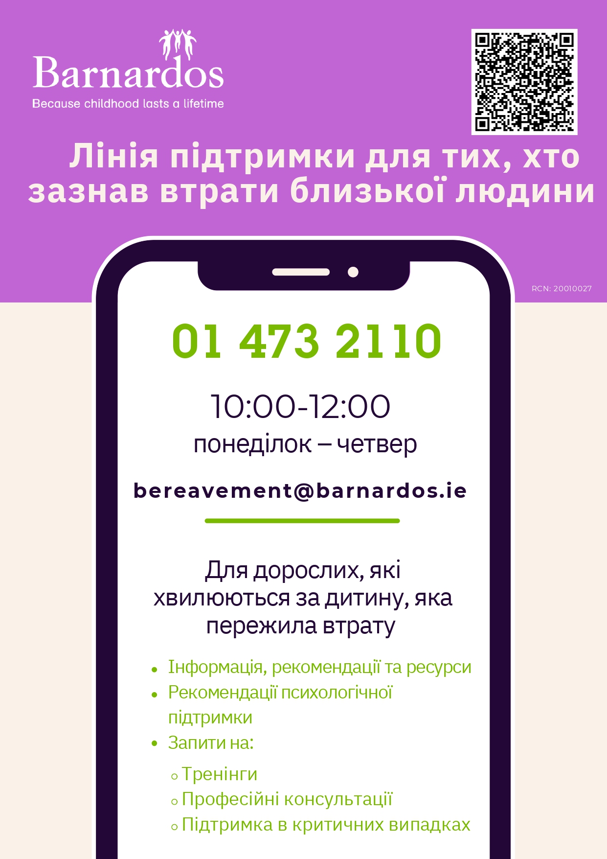 Барнардос – це благодійна організація,що пропонує терапевтичну підтримку дітям і сім’ям, близькі люди яких загинули через раптову, несподівану або насильницьку смерть, у тому числі через війну та політичні конфлікти. Пропонується підтримка як при травмі, так і під час горя, оскільки травматичні реакції часто можуть бути частиною процесу горювання.